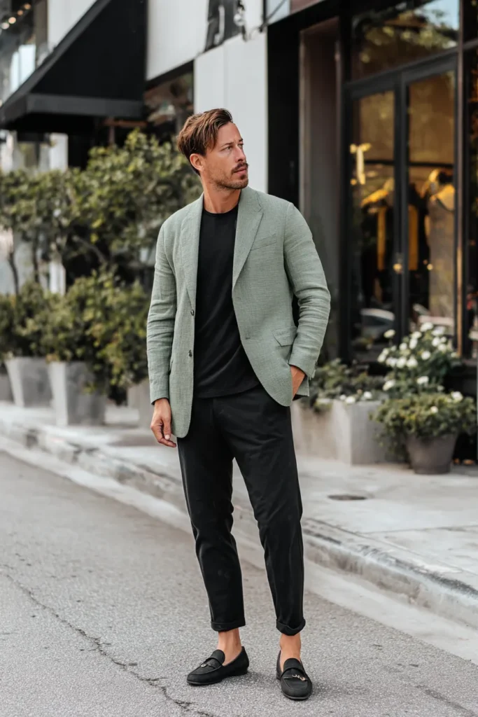 This is a fantastic light and breezy look that is perfect for warmer weather while still feeling incredibly polished and put-together. The centerpiece is a lightweight blazer in a gorgeous light sage or moss green, likely a breathable linen or cotton blend, worn over a simple black crewneck t-shirt. He pairs the blazer with sleek black trousers that are casually cuffed, and finishes the look with sophisticated black slip-on loafers, creating a streamlined, modern silhouette.