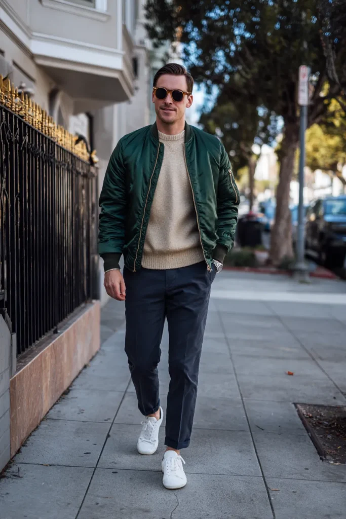 This outfit is the perfect mix of sporty edge and classic comfort, making it a wonderful everyday look for a day out in the city. The main attraction is a rich, dark forest green satin or nylon bomber jacket that instantly gives the outfit a cool, contemporary vibe. Underneath, a light beige or camel crewneck sweater provides soft contrast and cozy texture. The lower half features perfectly tailored navy blue trousers, casually cuffed, which are paired with crisp white sneakers for a clean, athletic finish.