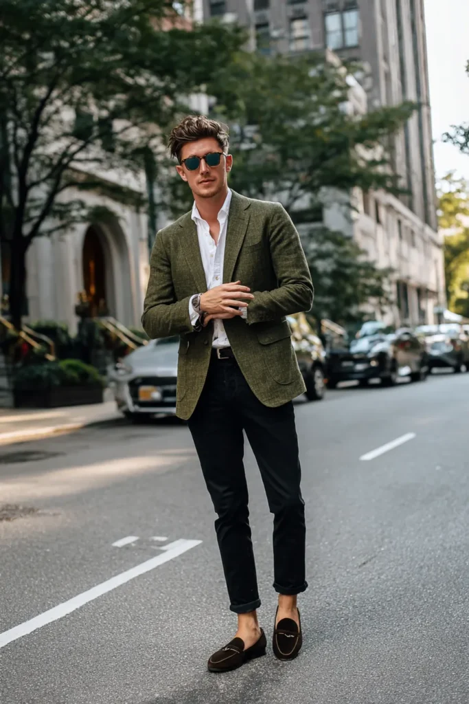 Talk about a fantastic smart-casual moment perfect for a weekend outing or a relaxed business setting. This sharp look centers on an olive green blazer with a great tweed or subtly textured weave, which gives it depth and character. Underneath, a crisp white dress shirt is worn casually unbuttoned at the top, and it’s paired with slim-fitting black trousers that are subtly cropped just above the ankle. The outfit is completed with dark brown suede loafers worn without socks for that effortlessly cool vibe, and a pair of chic sunglasses.