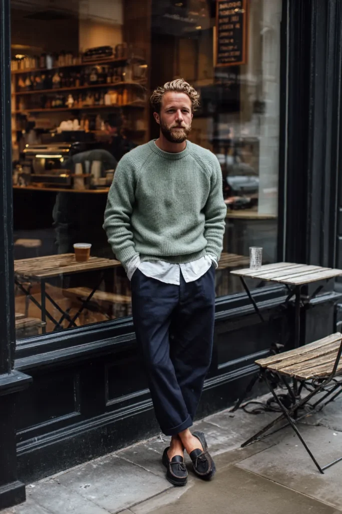 What makes this look truly special is the combination of textures and the soothing color palette. The soft, airy knit of the sweater contrasts beautifully with the structured navy trousers, and that light, dusty green is just divine paired with the deep blue. I love how the shirt layer adds depth without making the outfit feel too stuffy, and the rolled trouser cuff with the loafers gives it a charming, almost nautical-inspired smart-casual feel that’s perfect for city exploring.