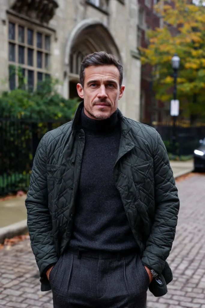 I think this look works so well because it sticks to a very dark, moody color palette, blending the deep green seamlessly with the charcoal grey. The textures are the real star here, with the quilted pattern of the jacket playing against the fine knit of the sweater and the rich wool of the trousers. It’s such a clever way to wear a dark color scheme without it feeling flat or boring, creating a look that’s perfectly rugged yet totally refined for a sharp, mature style.