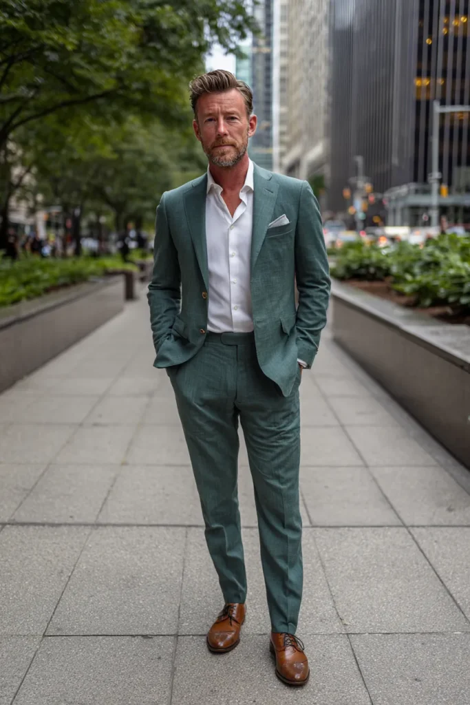 Oh my gosh, this suit is such a breath of fresh air and looks completely stunning for a formal event or a stylish day at the office. This is a perfectly tailored suit in a beautiful, somewhat muted dusty teal or sage green color that really stands out in the most elegant way. He’s wearing it effortlessly with an unbuttoned crisp white dress shirt—no tie needed here—and a matching white pocket square. The whole look is grounded by a pair of shiny, warm brown leather lace-up shoes which add a wonderful richness to the color palette.