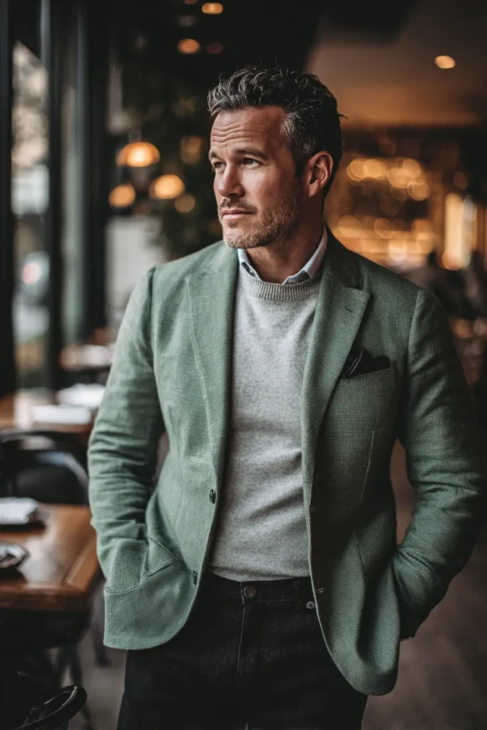 This smart-casual look is perfectly styled for a cozy yet polished feel, making it great for a dinner date or relaxed business lunch. The key piece is a beautiful, light pistachio green blazer with a visible texture or subtle check pattern, which gives it depth and interest. Layered underneath, there is a fine-gauge light grey crewneck sweater, worn over a white or light blue collared shirt with the top button undone. He pairs this soft upper half with dark, almost black trousers, grounding the lighter colors beautifully, and finishes the blazer with a contrasting dark pocket square.
