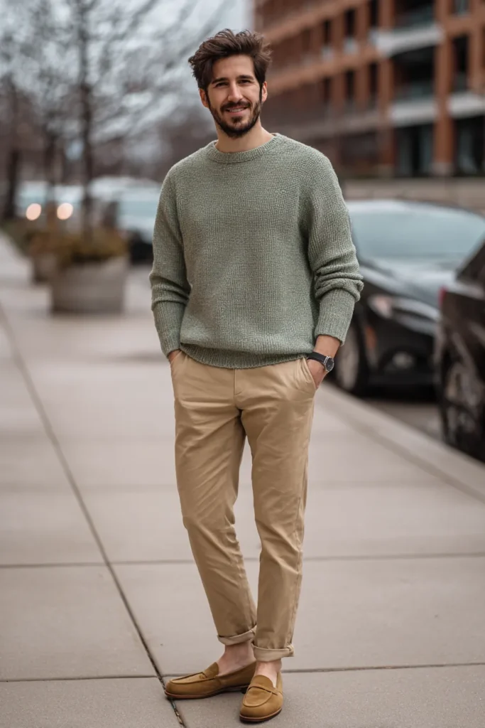 I am completely obsessed with this color combination because the soft green and the warm tan are a match made in heaven, making it feel effortlessly chic and earthy. The relaxed fit of the sweater and the cuffed chinos gives the look a super approachable, laid-back feel, while the sleek loafers keep it feeling elevated and refined. It’s such a simple pairing, but the attention to detail with the textures and harmonious colors truly makes this outfit a flattering winner for casual sophistication.