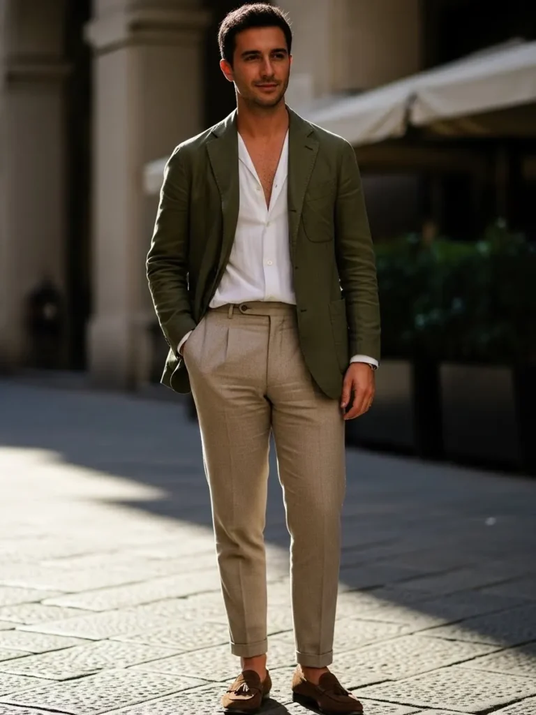 This outfit features an olive green blazer paired with a crisp white shirt and warm beige trousers.