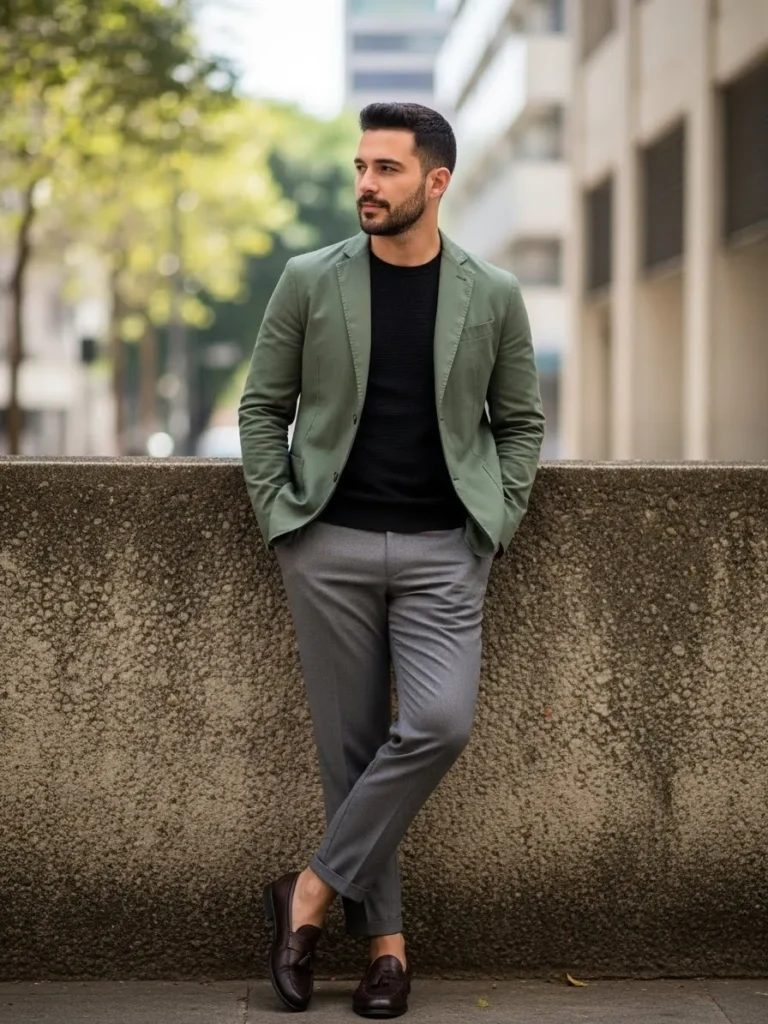 The green adds depth while the lighter pants keep it fresh.