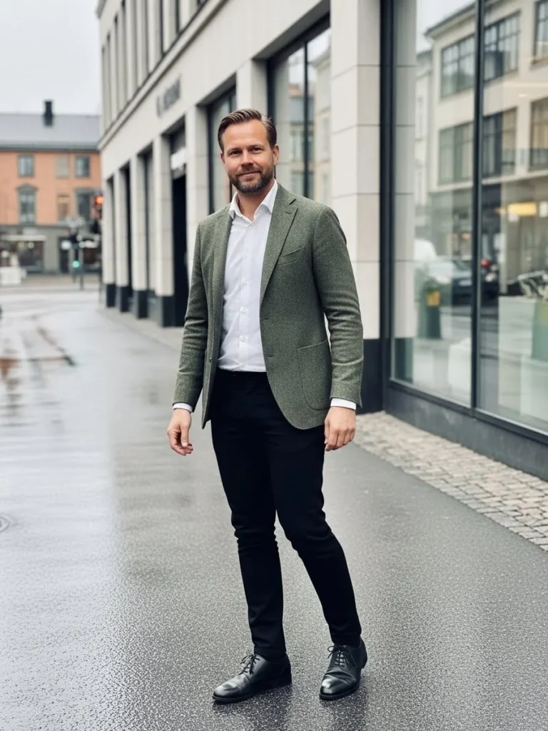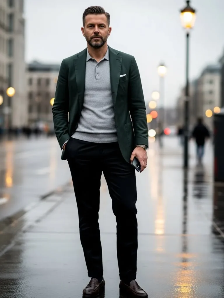 This outfit features a deep green jacket styled with a light shirt and dark trousers.