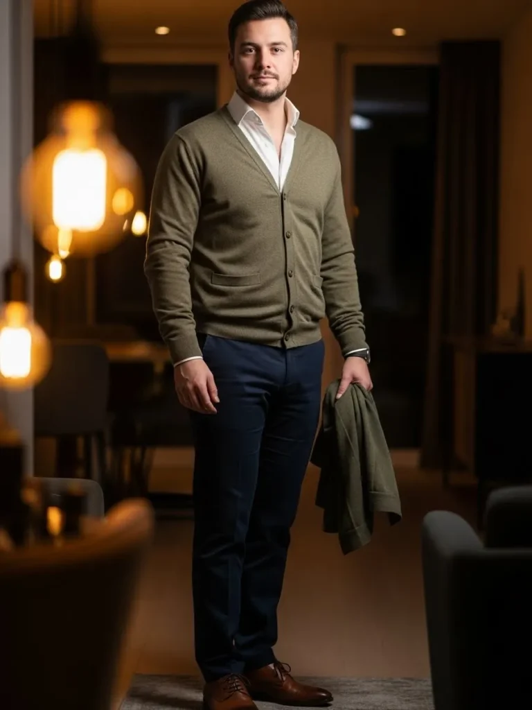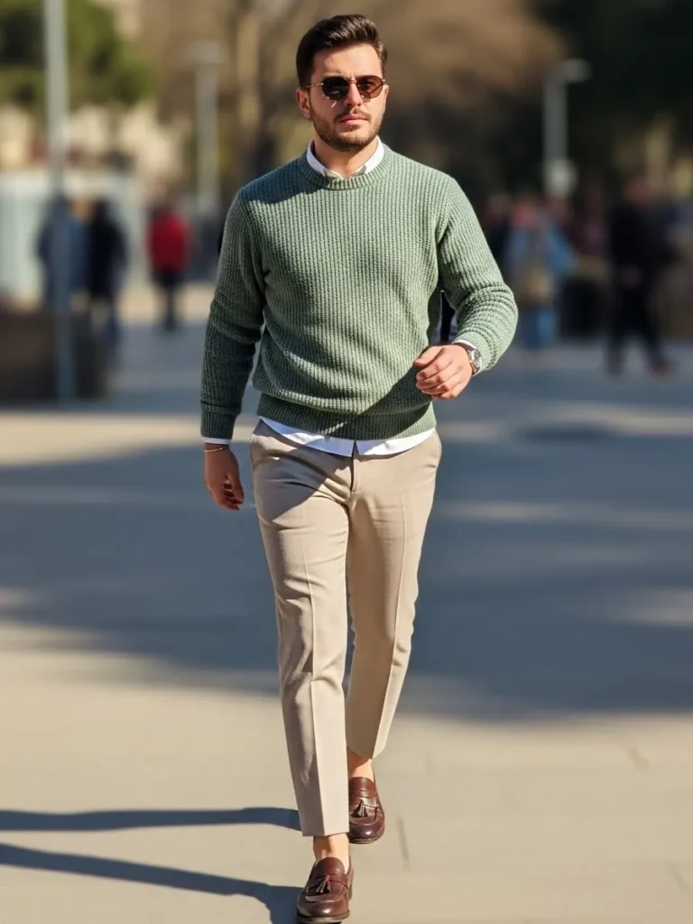This outfit features an olive green knit paired with dark trousers and classic shoes.