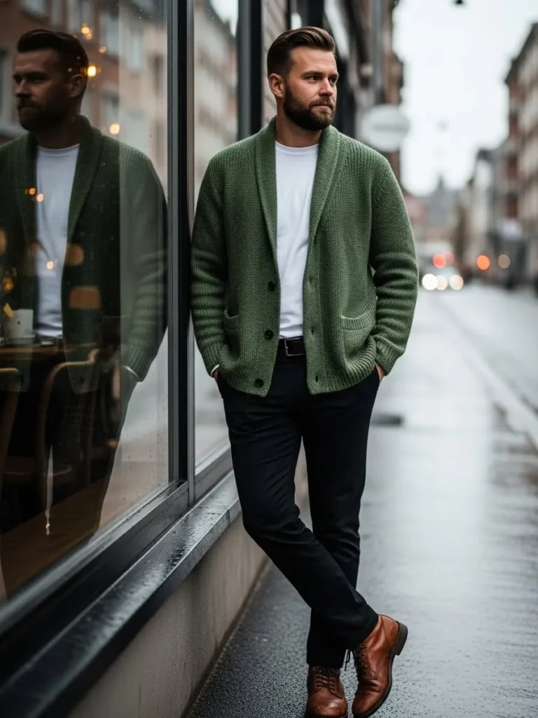 Here a soft green cardigan is worn over a white tee with dark trousers and brown shoes.