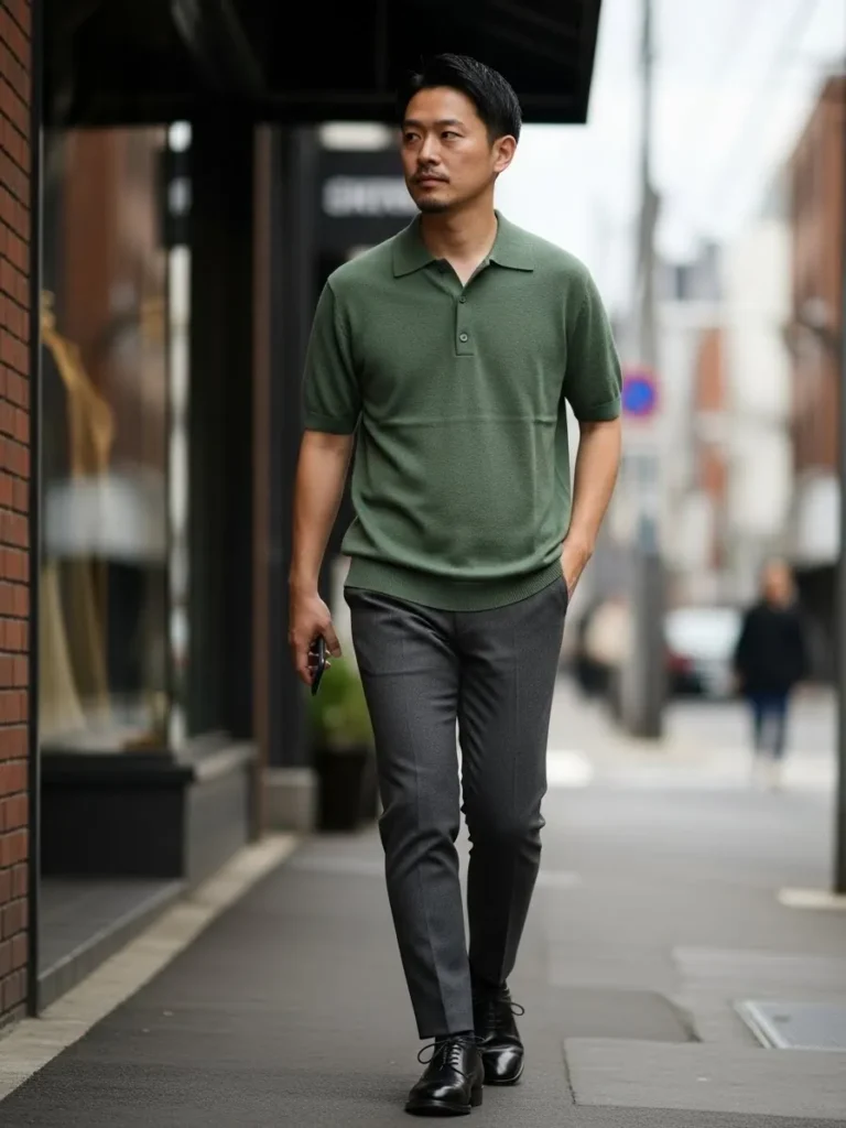 Here we see a muted green polo styled with slim dark trousers and clean shoes.