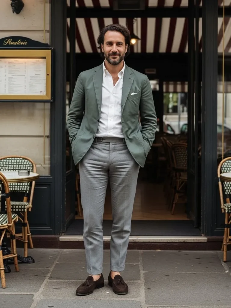 This outfit combines a green blazer with a simple shirt and tailored trousers.