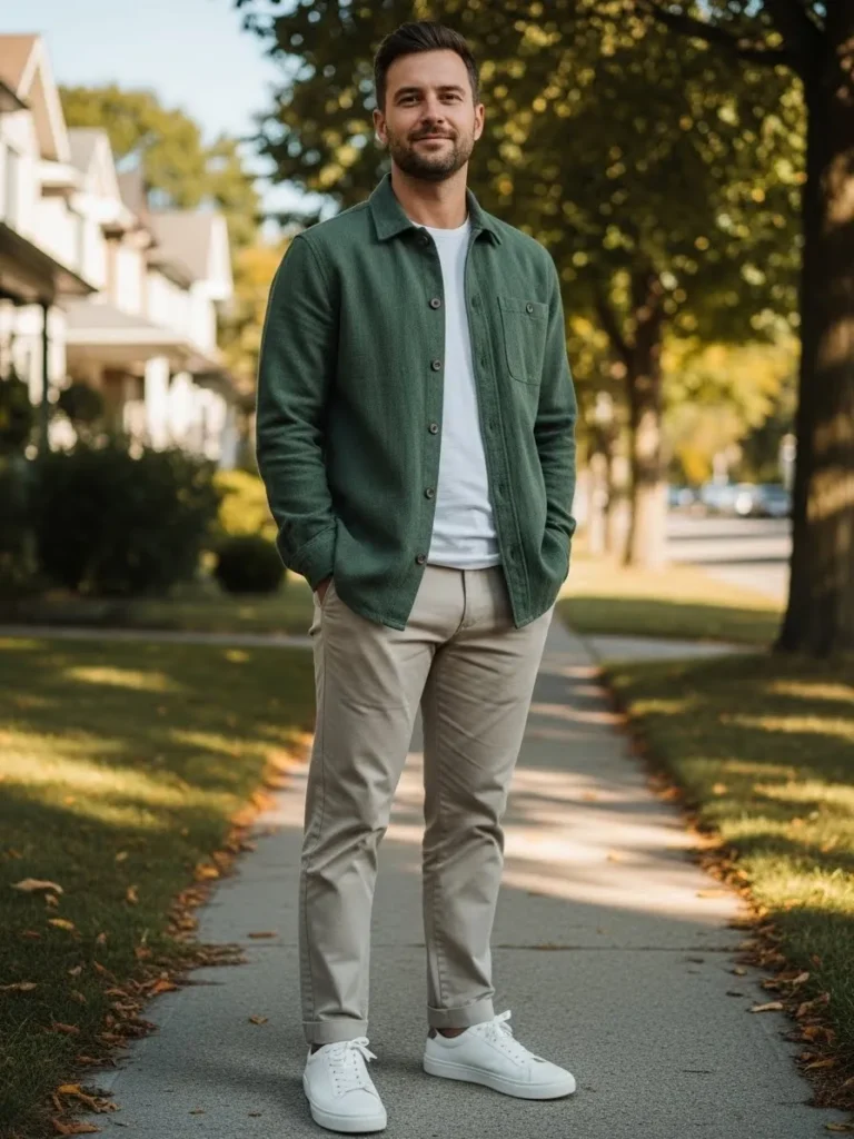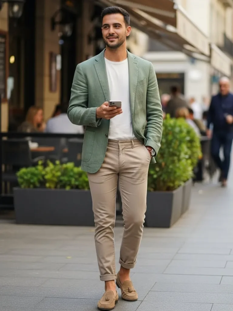 Here a green casual jacket is styled with a white tee and light neutral trousers.