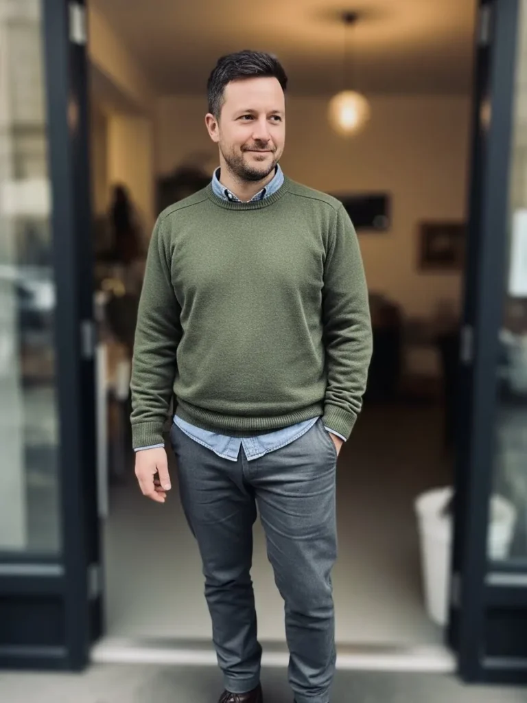 This outfit features a soft green sweater layered over a crisp shirt and paired with slim gray trousers.