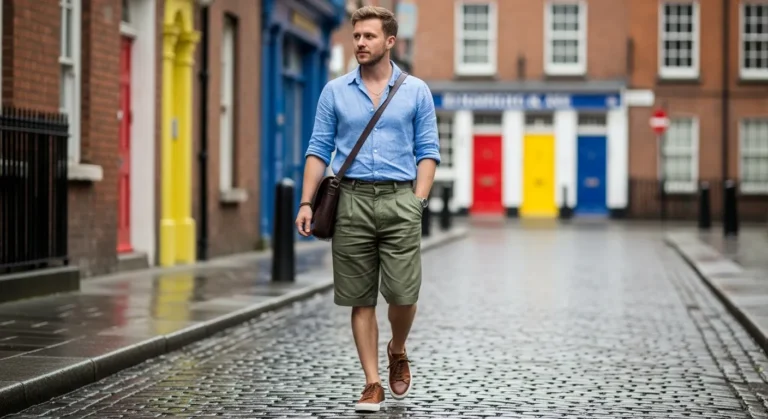 This outfit pairs a light blue rolled sleeve shirt with olive green tailored shorts and brown loafers. The earthy tones feel relaxed and natural while still looking refined. The fit looks comfortable but intentional which makes the outfit feel very wearable. It has a slightly European city vibe.