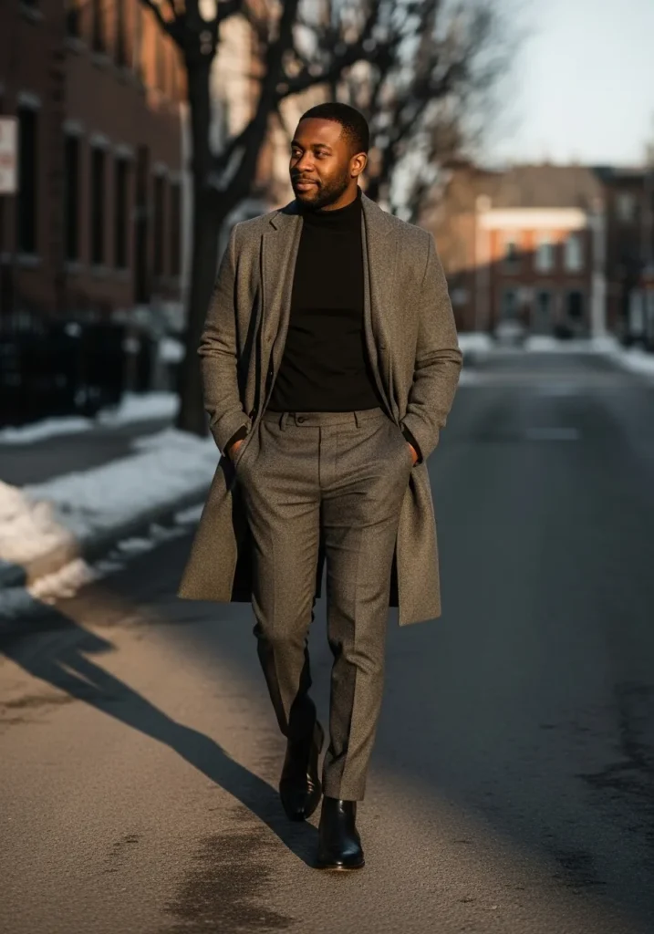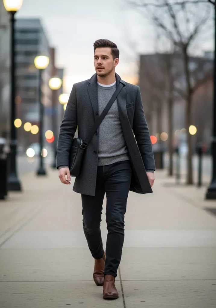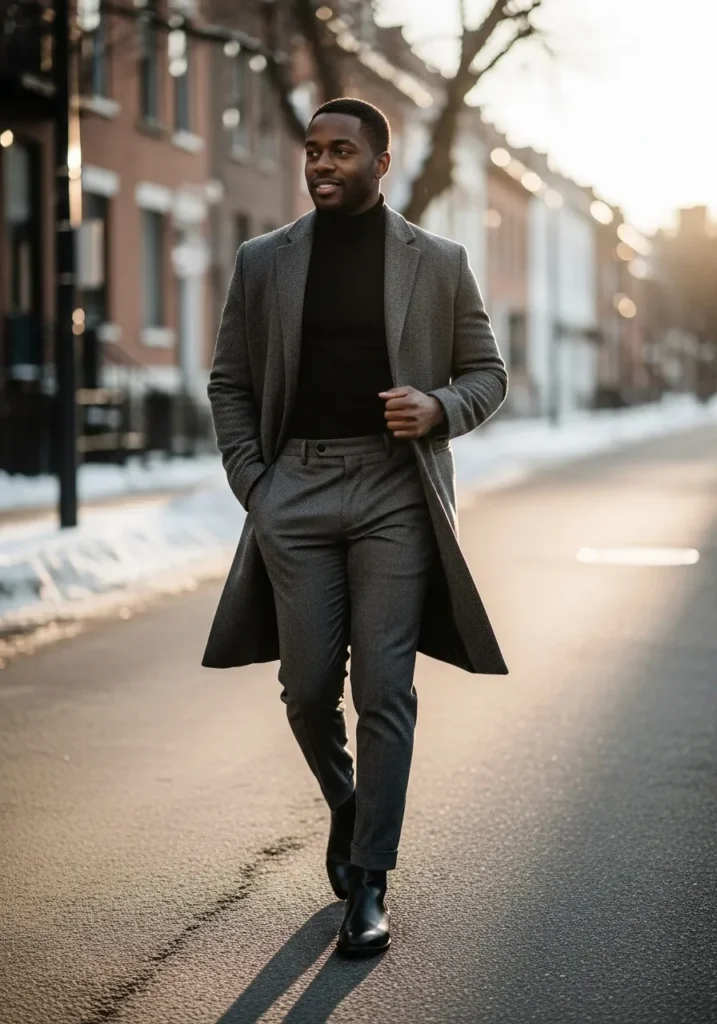 This look pairs a dark wool coat with a fitted gray knit top and slim black trousers. The clean lines and neutral tones feel modern and understated while leather boots add a polished winter finish. Everything fits close to the body which keeps the outfit sharp without looking stiff.