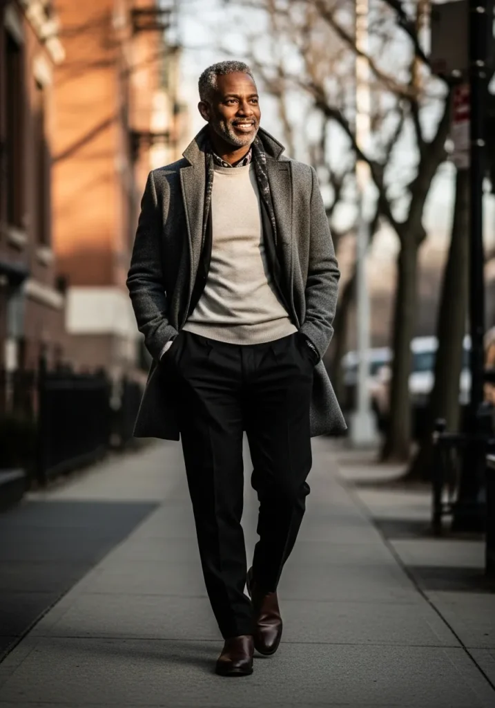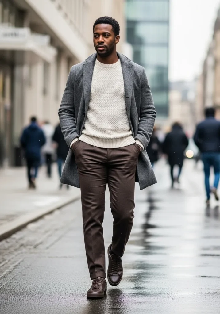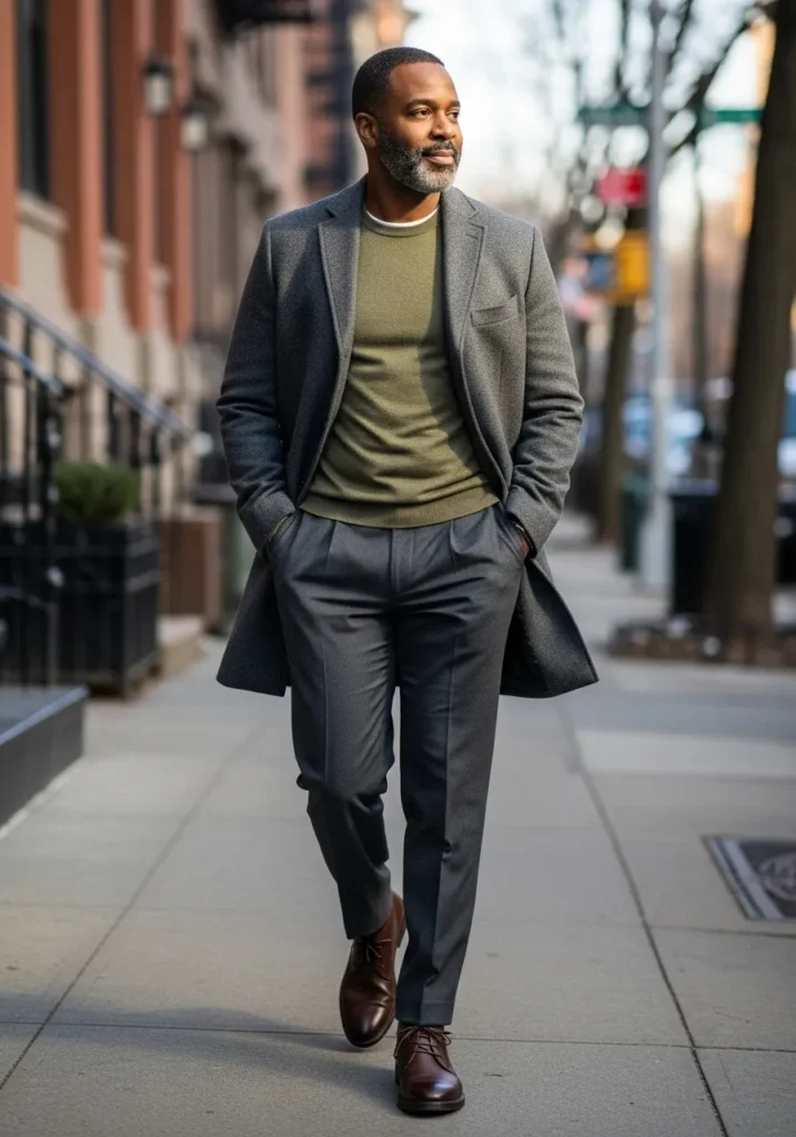 A dark coat is worn over a muted green sweater and styled with gray trousers and brown shoes. The colors feel soft and balanced which makes the outfit easy on the eyes. Everything works together naturally.