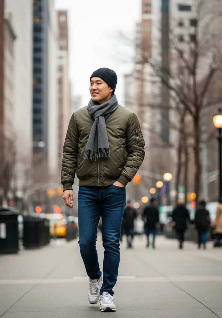 Here we have a padded olive jacket paired with a cozy scarf, dark denim, and casual sneakers. The beanie adds warmth while keeping the look relaxed and approachable. The layers feel practical and effortless for colder city days.