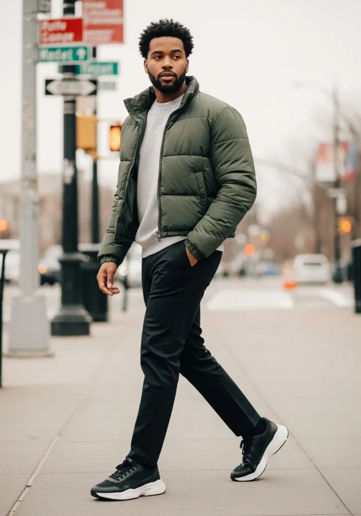 This look combines a green puffer jacket with a light knit top, dark trousers, and sneakers. The balance between sporty and clean makes it feel modern and fresh. The fit keeps everything looking neat instead of bulky.