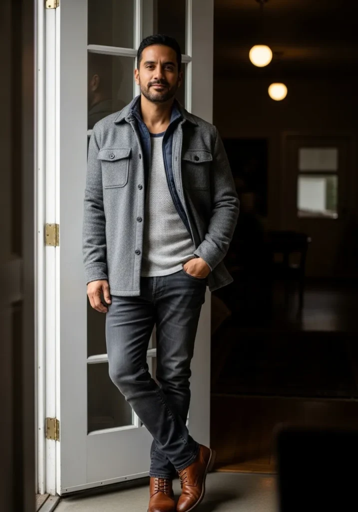 A gray overshirt style jacket is layered over a dark top and black jeans, finished with brown leather boots. The textures feel rich and cozy while the darker palette keeps it sleek. It works perfectly for moving between indoors and outdoors.