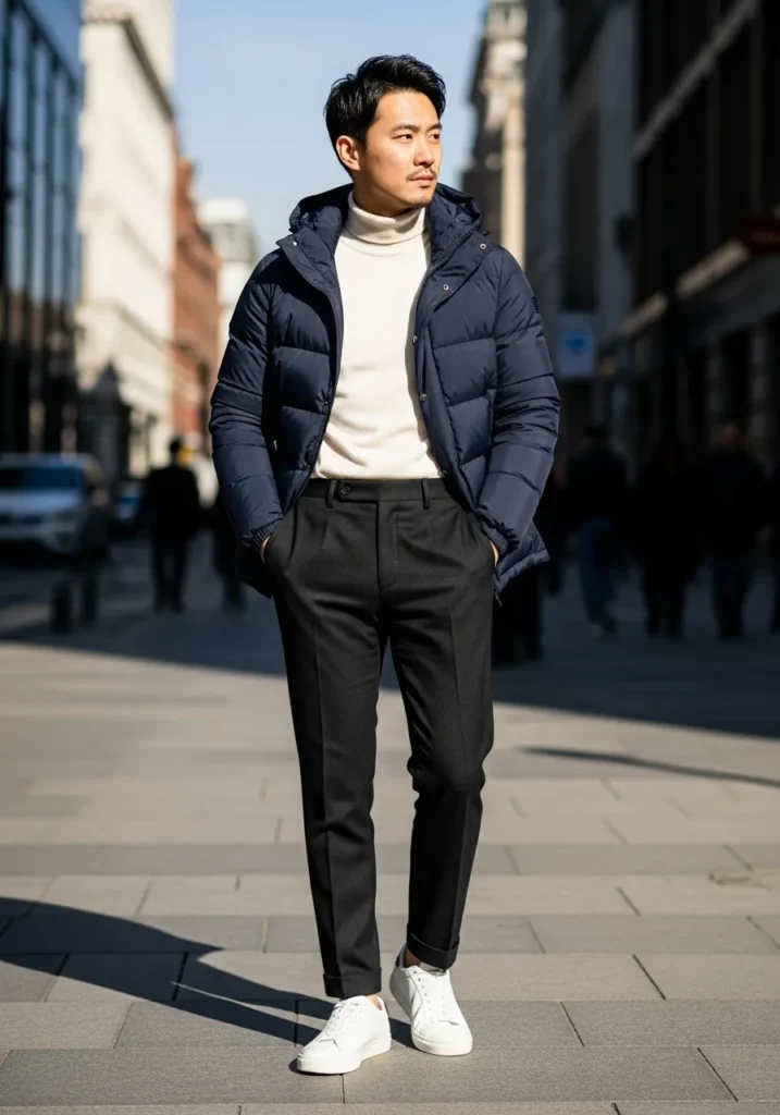 A navy padded jacket is layered over a soft cream sweater and styled with tailored black pants and bright white sneakers. The mix of sporty and refined pieces keeps the look fresh and balanced. The lighter sweater also brightens up the darker winter layers.