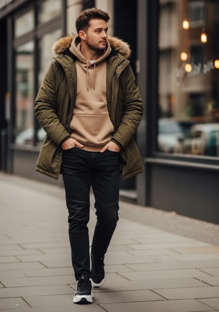 An olive parka is styled over a soft beige hoodie and paired with black jeans and casual sneakers. The layers feel relaxed and practical while still looking neat. The parka adds structure so the hoodie does not feel sloppy.