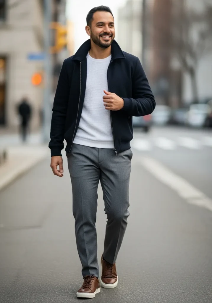 A dark casual jacket is worn over a white knit top and styled with gray trousers and brown boots. The color palette is simple and easy which makes the outfit feel effortless. Everything looks comfortable but still neat.