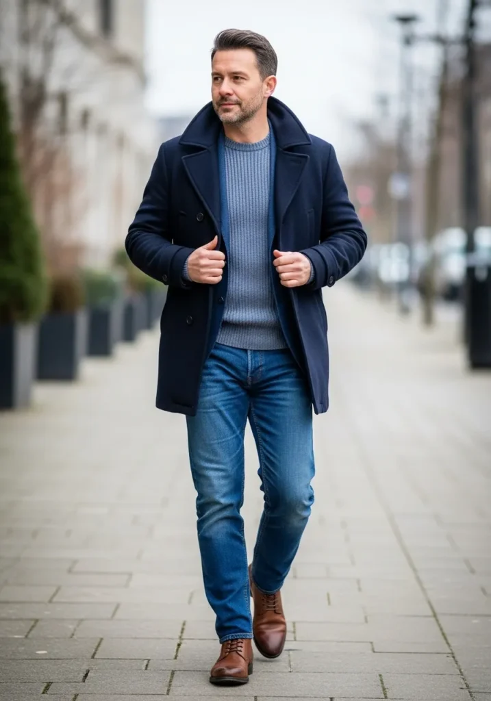 A navy coat is layered over a blue sweater and paired with denim jeans and leather boots. The colors are classic and familiar which makes the outfit feel timeless. The coat adds structure while the jeans keep it casual.