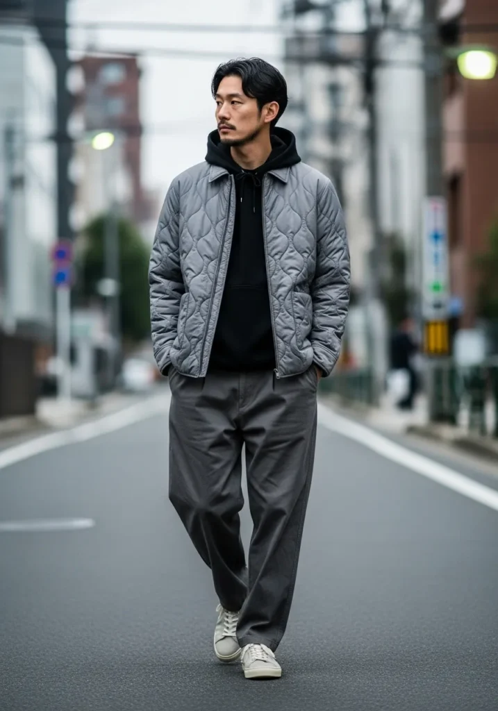 A gray quilted jacket is styled over a black sweater and paired with relaxed trousers and sneakers. The textures keep it interesting while the darker base keeps it polished. The fit stays clean and modern.