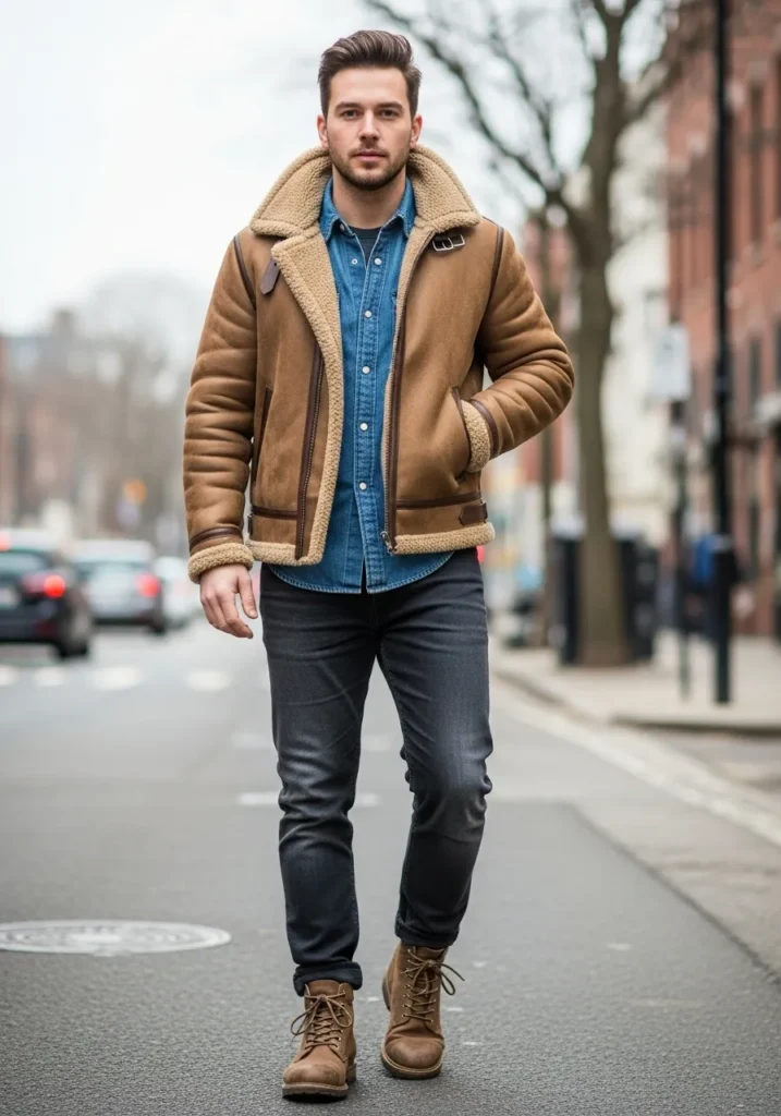 A tan shearling style jacket is layered over a denim shirt and paired with dark jeans and sturdy boots. The textures feel rich and warm which is perfect for cold weather. The look has a slightly rugged edge.